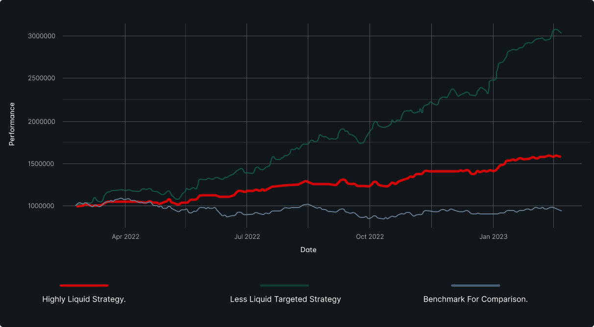 Book a CallThe chart displays an example of a 12-month performance comparison between a liquid mega-cap equity strategy, a sector-based equity strategy, and their respective benchmarks.